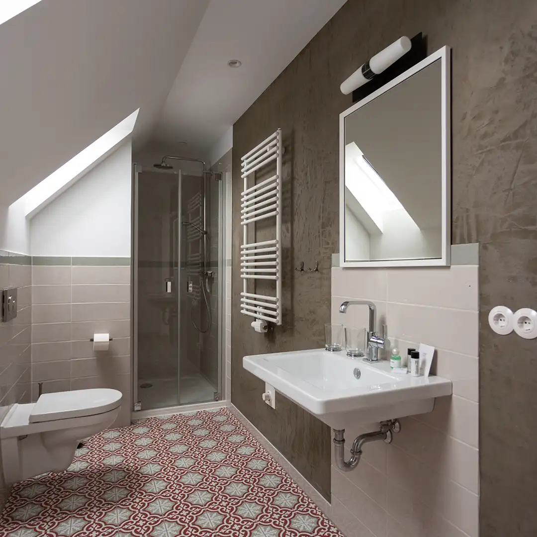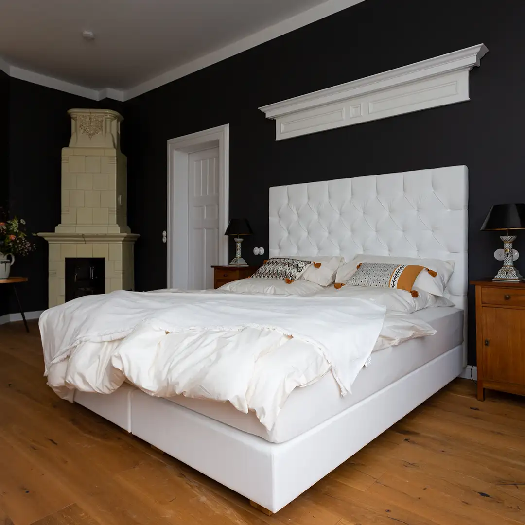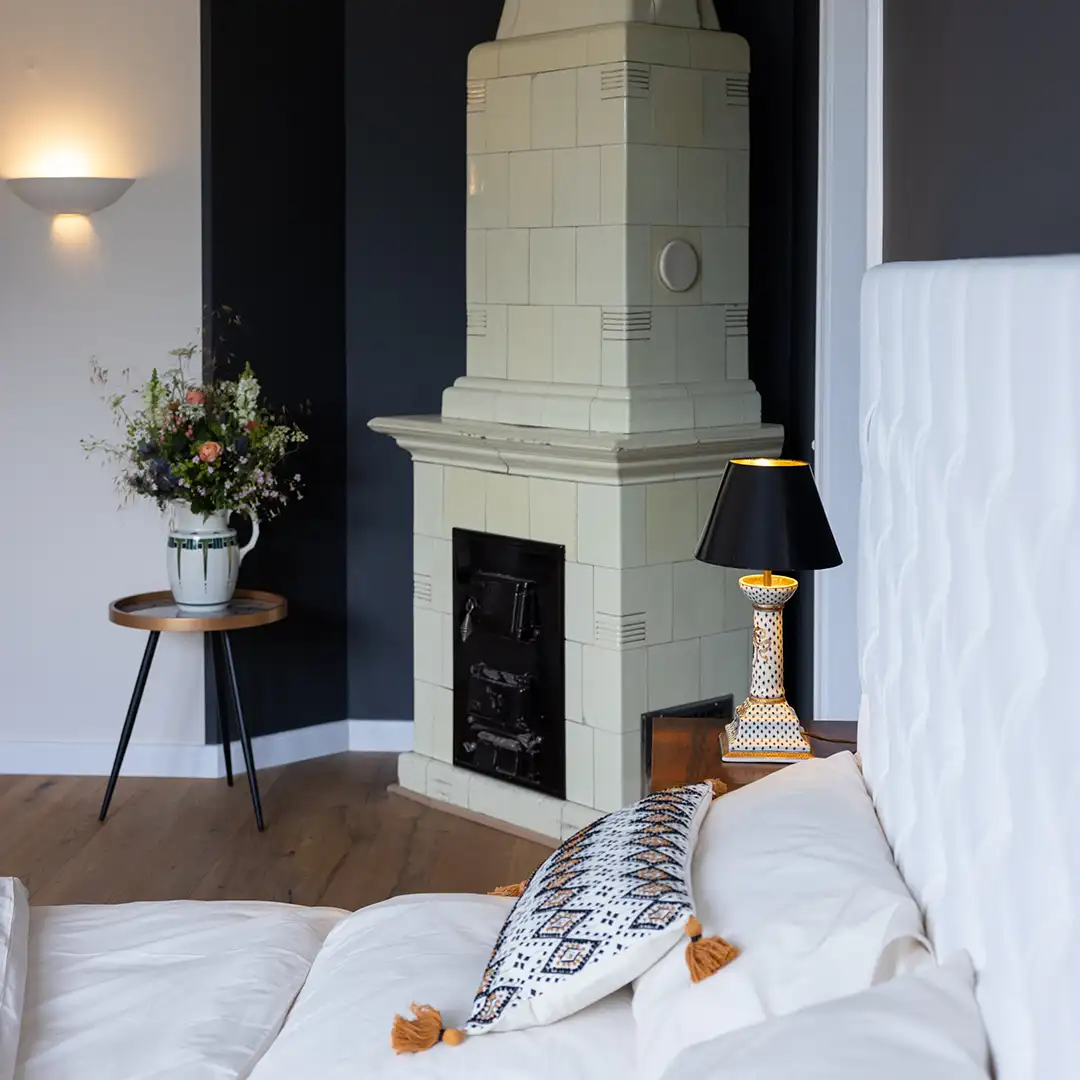 Abgerundet wird das Ambiente durch moderne Bäder, historische Fliesen und antike Kachelöfen.