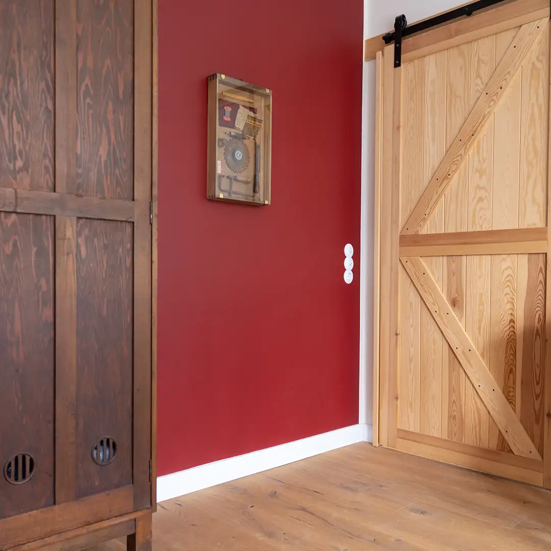 Das Doppelzimmer ist unser kleinstes Zimmer. Das sichtbare Mauerwerk, die Stalltür, der Spind und die alte Badewanne sind ein Highlight.