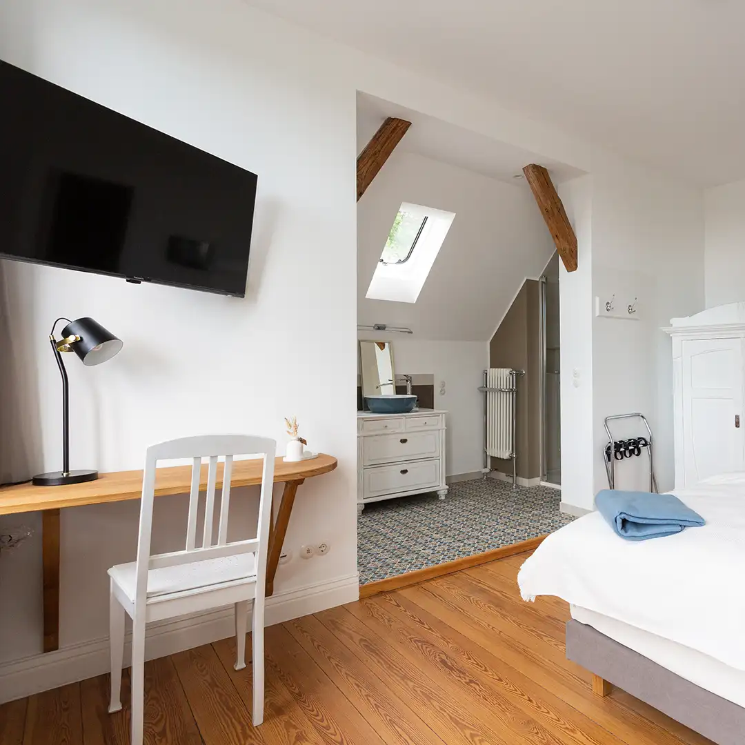 Unser Waldzimmer ist sehr geräumig und bietet ein separates Schrankzimmer. Mit der Sitzecke und dem Blick auf unseren alten Walnussbaum gemütlich, klar und sanft.